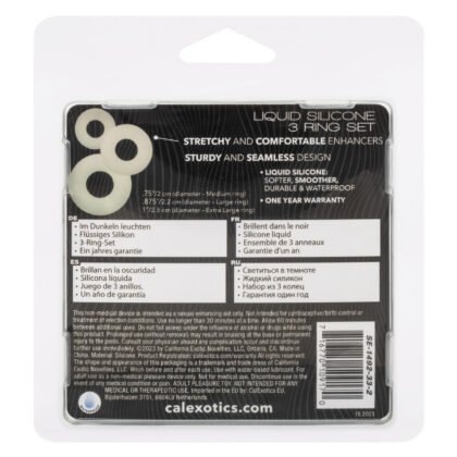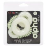 Embárcate en un encantador viaje de placer con el Set de 3 Anillos Alpha de Silicona Líquida Brillan en la Oscuridad, una colección diseñada para llevar tus momentos íntimos a un nuevo nivel de emoción. Este set premium, con tres potenciadores distintos, es ideal para quienes valoran la combinación perfecta de comodidad, durabilidad y experiencias emocionantes en sus escapadas íntimas. Cada anillo está hecho de silicona líquida de alta calidad, un material suave, liso y duradero.