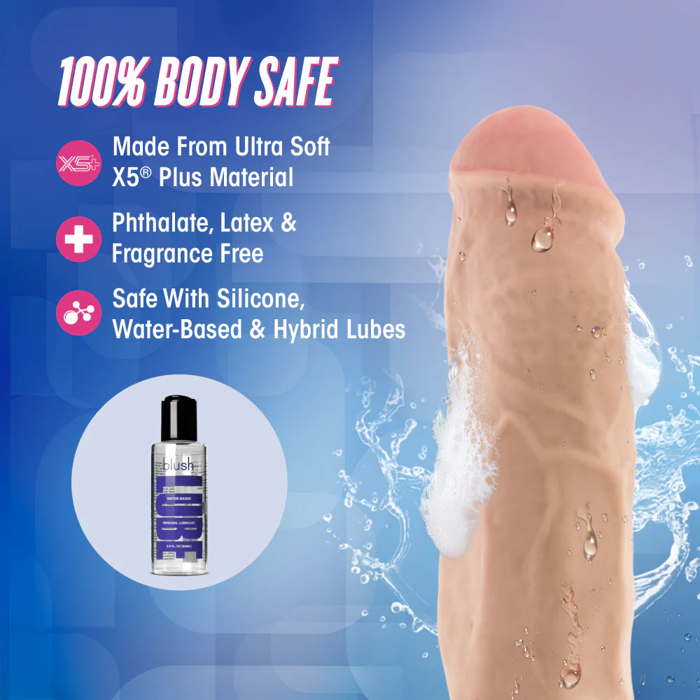 Descripción del producto Big Boy es un dildo gigante de doble densidad de 25,4 cm. Elaborado artesanalmente con nuestra tecnología de doble densidad Sensa Feel, Big Boy ofrece una sensación suave y realista con un núcleo más firme para una erección más firme. Gracias a la tecnología FlexiShaft®, el dildo se mantiene erecto pero a la vez suave y flexible para adaptarse a tu cuerpo. Su base de ventosa resistente permite adherirlo a cualquier superficie lisa, plana y no porosa para disfrutar de una experiencia intensa. Big Boy es seguro para el cuerpo y fácil de limpiar con agua y jabón, secándolo con una toalla. Big Boy mide 25,4 cm de largo total, de los cuales 17,8 cm son totalmente insertables, y tiene un grosor de 6,3 cm. Hecho a mano con una mezcla de TPE X5 y X5 Plus ultrasuave. ¡Es fácil de limpiar! Simplemente lávalo con agua tibia y jabón, o con tu limpiador de juguetes favorito, antes y después de cada uso. Sécalo con una toalla suave antes de guardarlo. Dale un nuevo aire a tu juguete con nuestro polvo revitalizante Blush. Disfruta de la tranquilidad de saber que los productos Blush siempre son sometidos a pruebas de seguridad por laboratorios independientes. Nuestro producto cumple con las normas de seguridad Prop65 de EE. UU. y REACH de la UE. Cuida lo que introduces en tu cuerpo. Silicona, base acuosa, compatible con lubricantes híbridos.