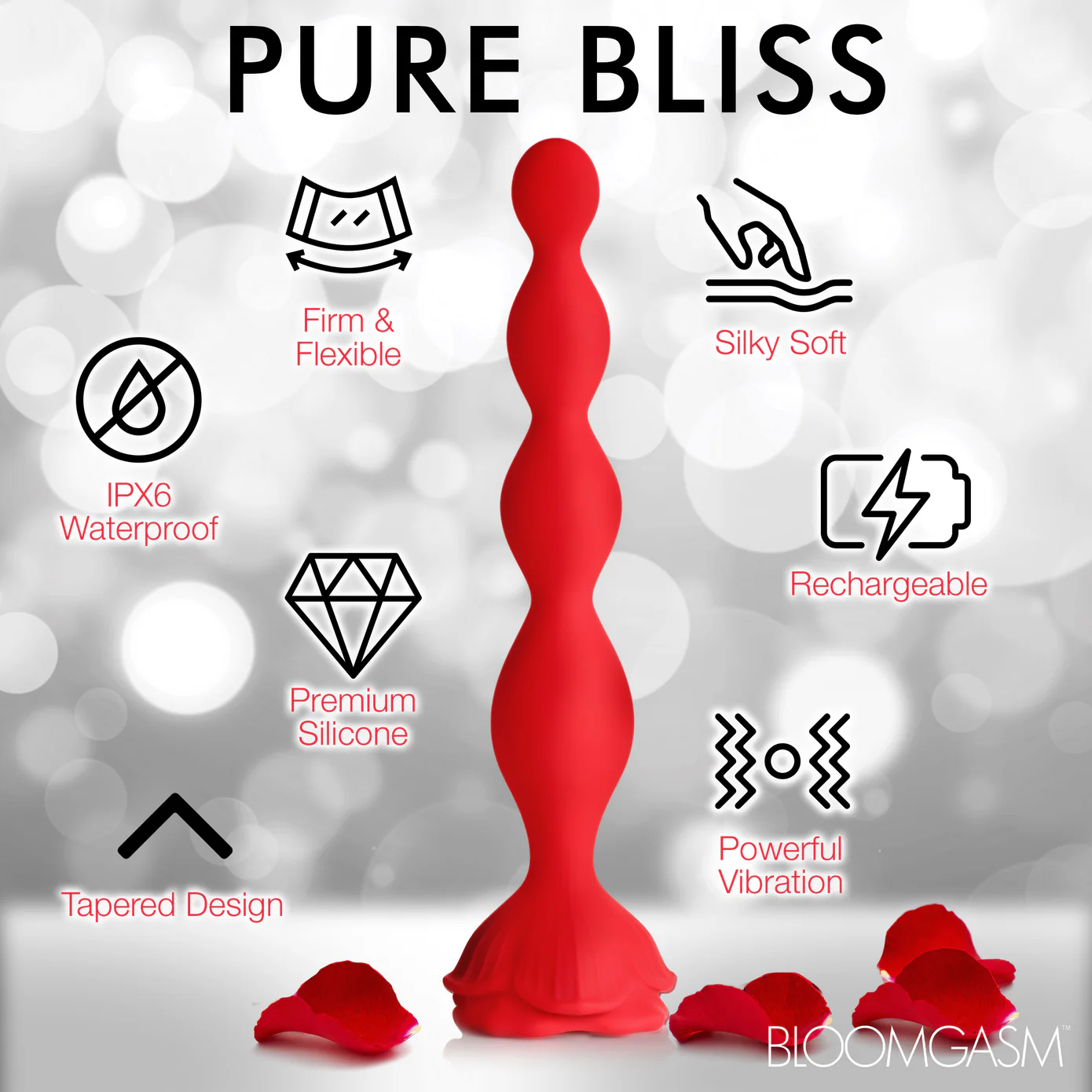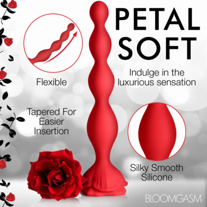 ¡Tu placer íntimo está a punto de florecer con este vibrador de rosa con cuentas! Su punta suave, redonda y cónica facilita la inserción. ¡Disfruta de cada una de las 4 cuentas graduadas a lo largo del tallo de esta floreciente base de rosa! El tallo flexible y con cuentas se dobla para complementar tus curvas internas.