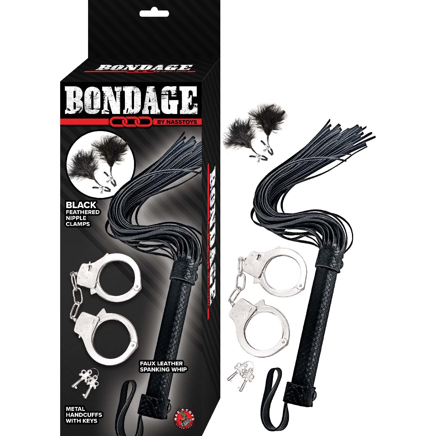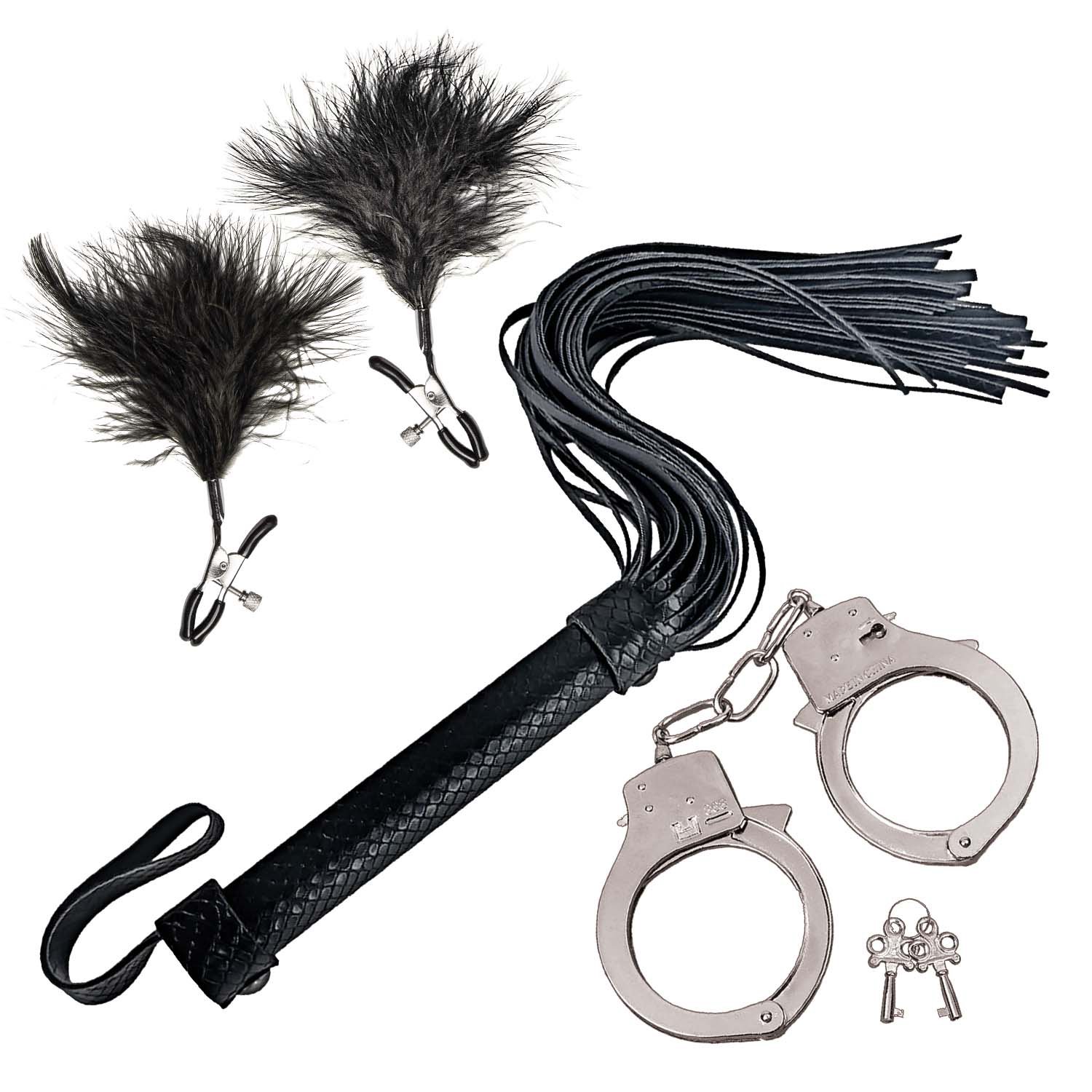 BONDAGE BY NASSTOYS WHIP, FEATHER & CUFFS-BLACK