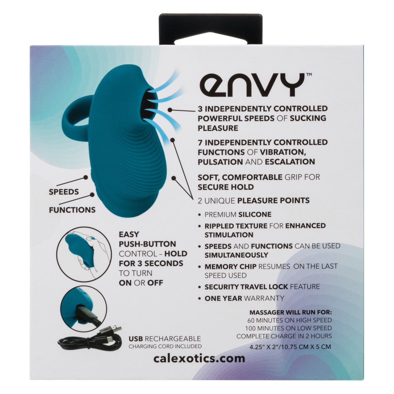 Recargable por USB-C con el cable de carga incluido, el masajeador de succión portátil Envy se carga completamente en 2 horas y ofrece hasta 60 minutos de intenso placer a alta velocidad o 100 minutos a baja velocidad.