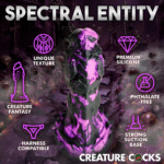 Cuando la muerte te atrape, ¡más te vale desear que Reaper sea así de ardiente! Este dildo morado y negro es amenazantemente grande, con crestas texturizadas, protuberancias, ranuras y púas. El borde de la corona está rematado con protuberancias puntiagudas y es más ancho en la parte superior que en el centro.