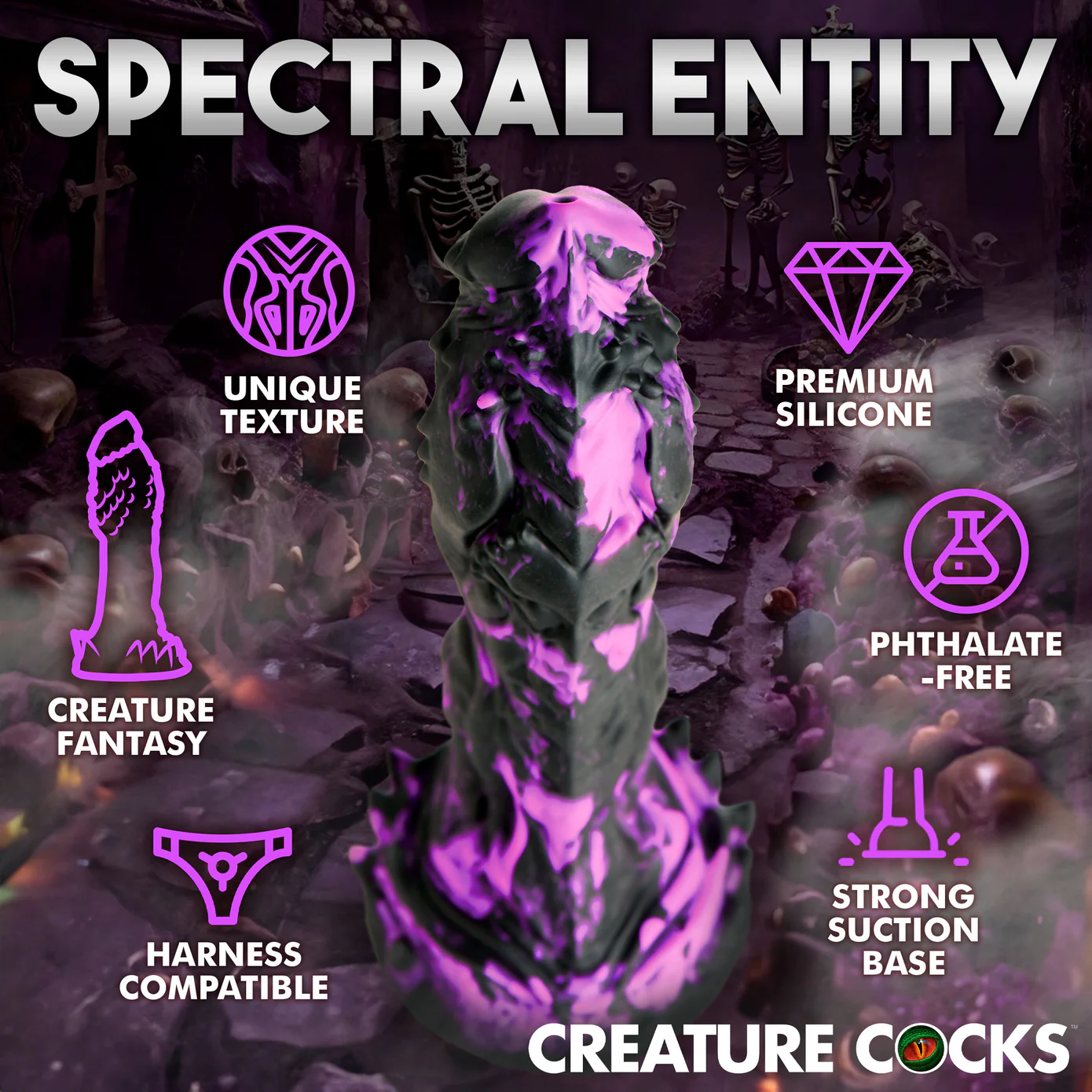 Su base ancha proporciona una potente succión para que puedas usar las manos libres colocándolo sobre cualquier superficie plana para mantenerlo en su lugar. ¡También puedes combinarlo con un arnés con correa compatible para juegos de pegging! Hecho de silicona premium sin ftalatos, tiene un núcleo firme y una superficie suave y sedosa. ¡Explora todas las escenas de ciencia ficción, fantasía, juegos de rol o cosplay que desees con este épico juguete para adultos!