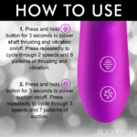 Enciende el juguete e introdúcelo mientras dejas que el extremo de empuje separe tus labios de forma natural. Comienza a girar y ajustar hasta encontrar el punto perfecto, ¡y luego alinea el brazo de succión con tu clítoris!