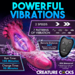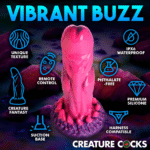 ¡Explora tus fantasías más oscuras con avispas alienígenas gigantes y zumbadoras y prueba este dildo gigante con aguijón! Este dildo rosa brillante tiene detalles morados, una punta suave y cónica, un cuerpo curvado y nudos sobre la base puntiaguda.